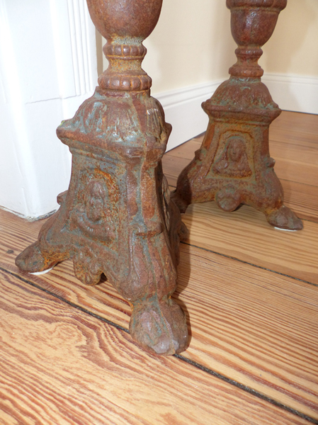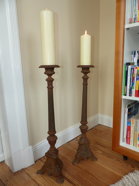 2 schwere, massive Gusseisen-Kerzenständer.