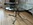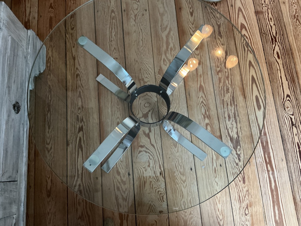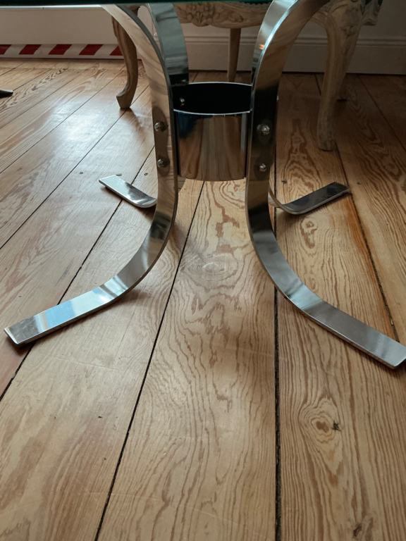 Schwere Glasplatte auf einem für diese Zeit typischen Tischfuß aus Metall