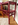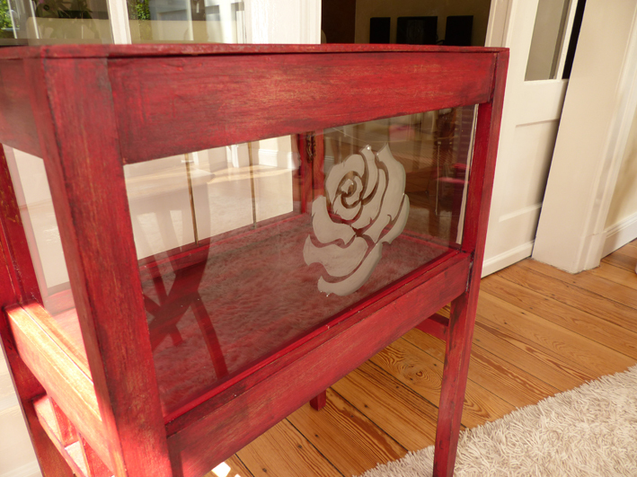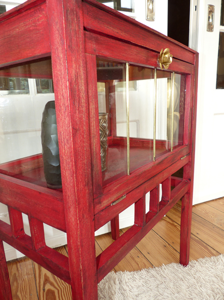 Schöne Glasvitrine aus Weichholz in Blutrot und Schwarz gefasst.