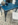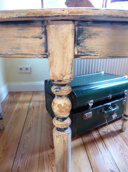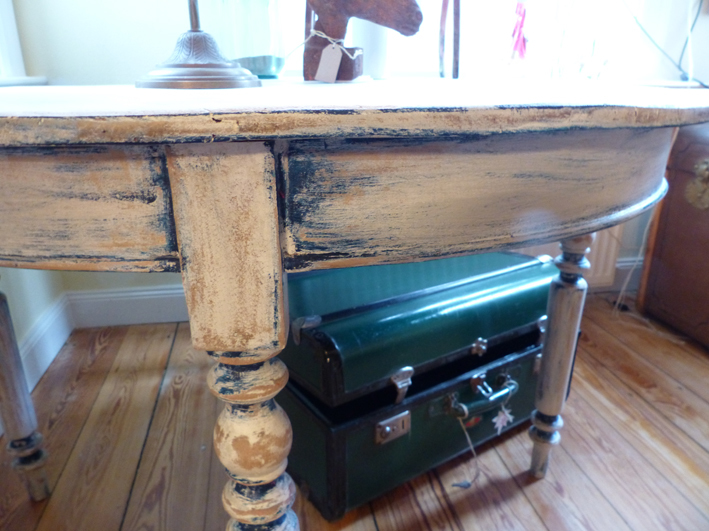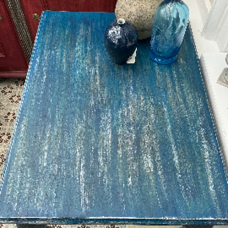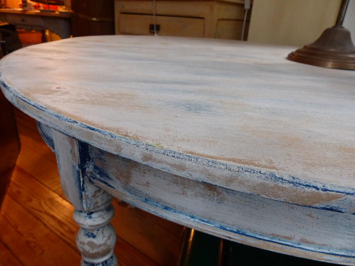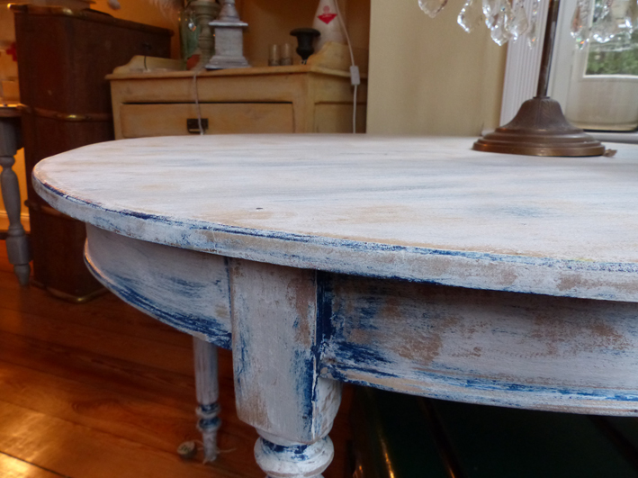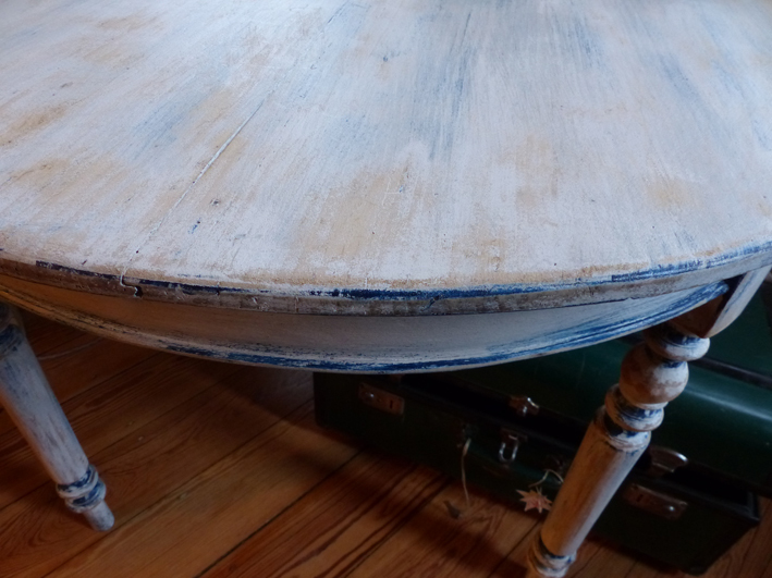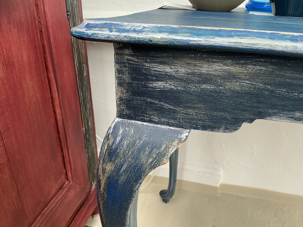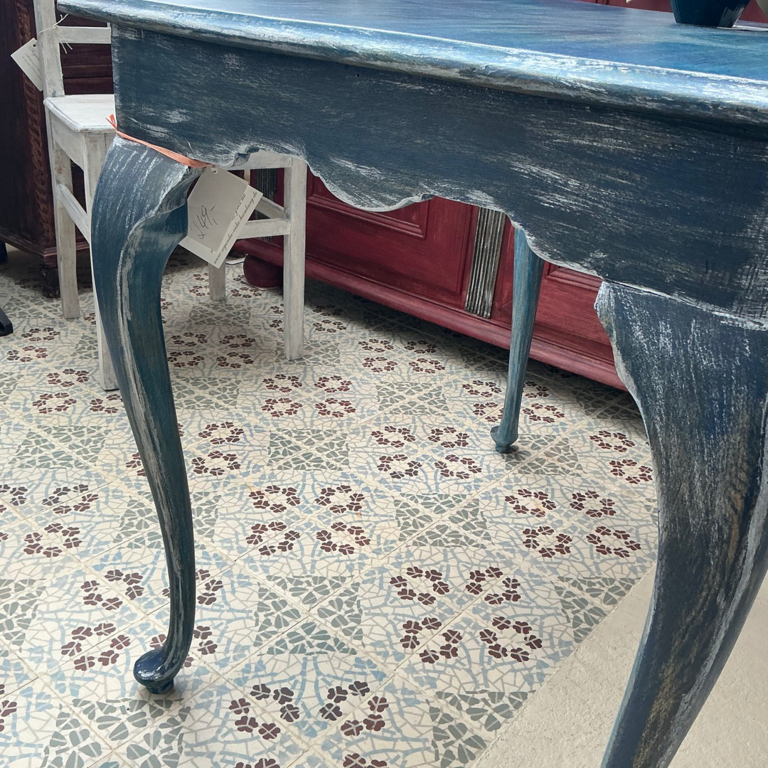 Schöner massiver Tisch in mehreren Blautönen gefasst.