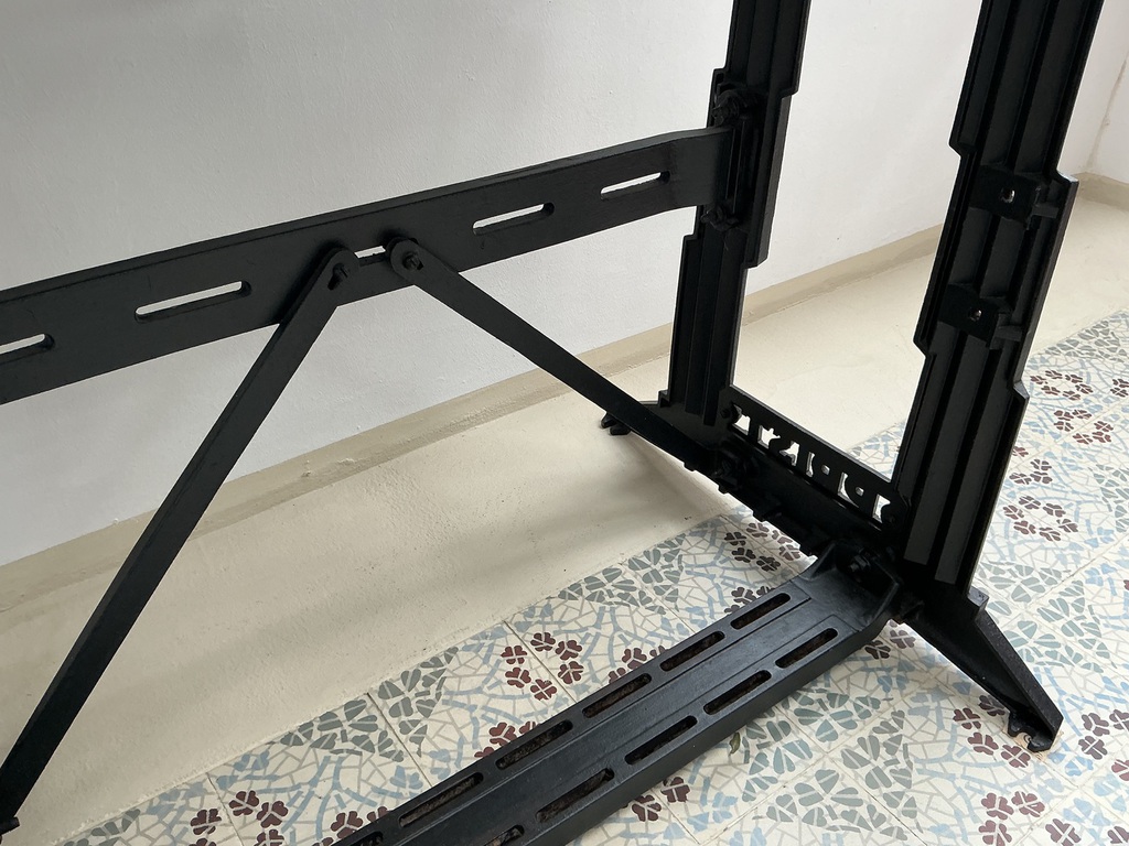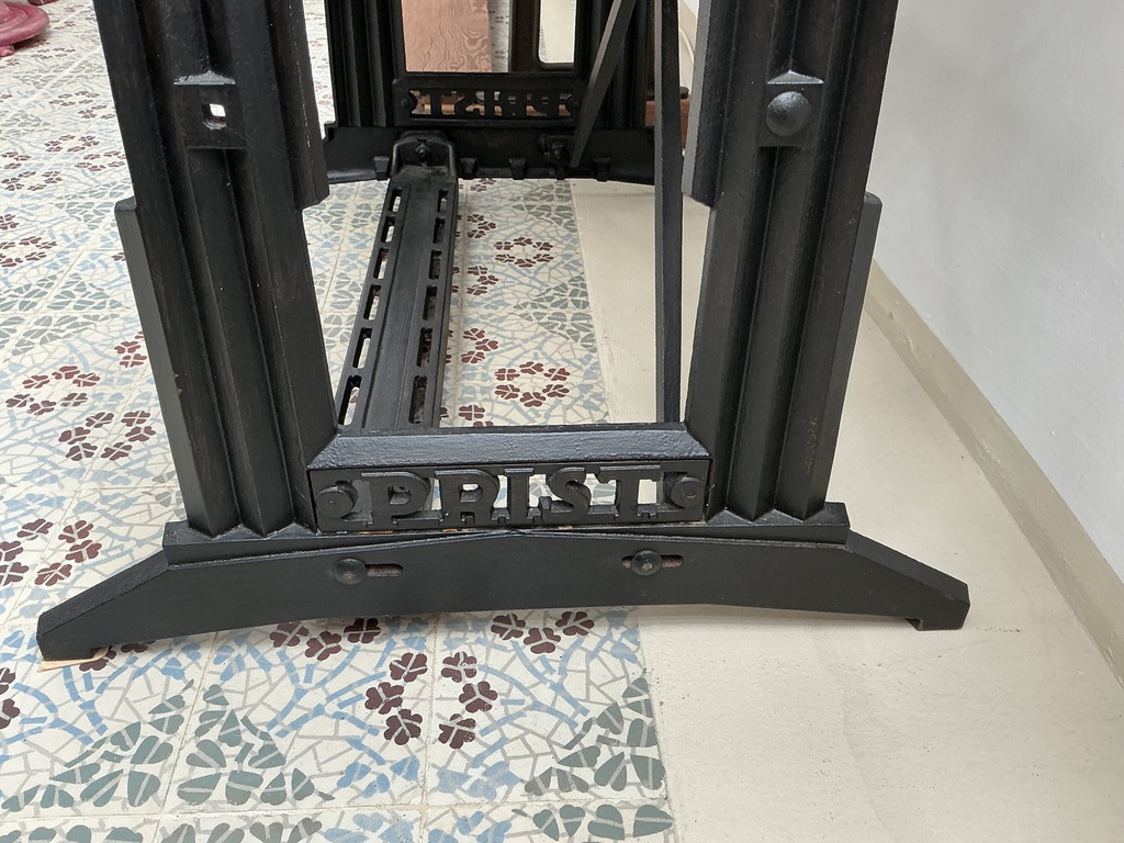 Massives Eisengestell einer alten Maschine in schwarz. Den Gestellbeinen zu