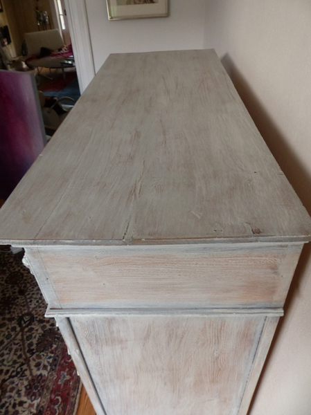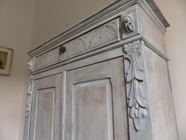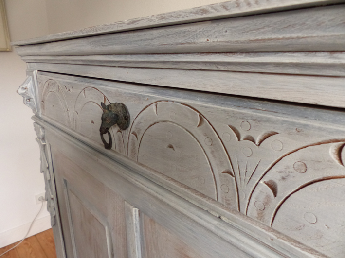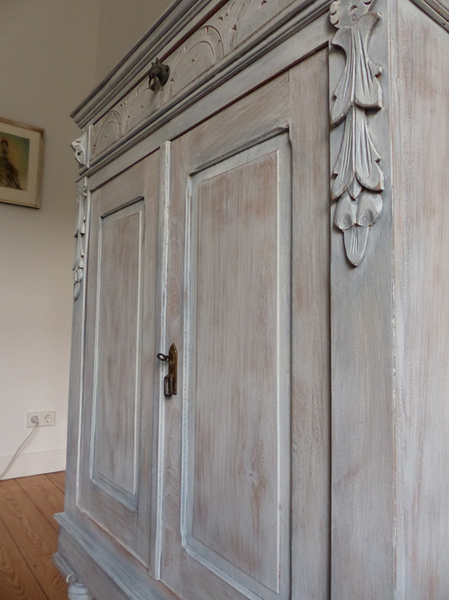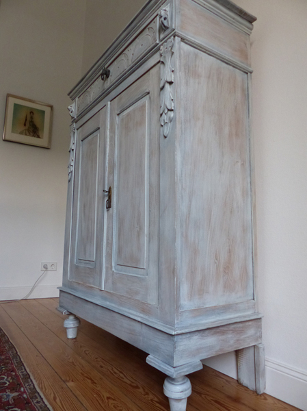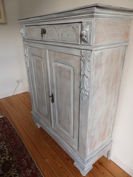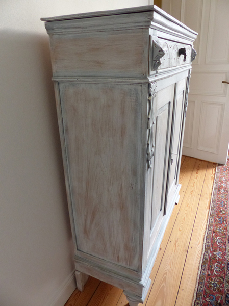 Das Vertiko ist in grau/blau Farbtönen gefasst.